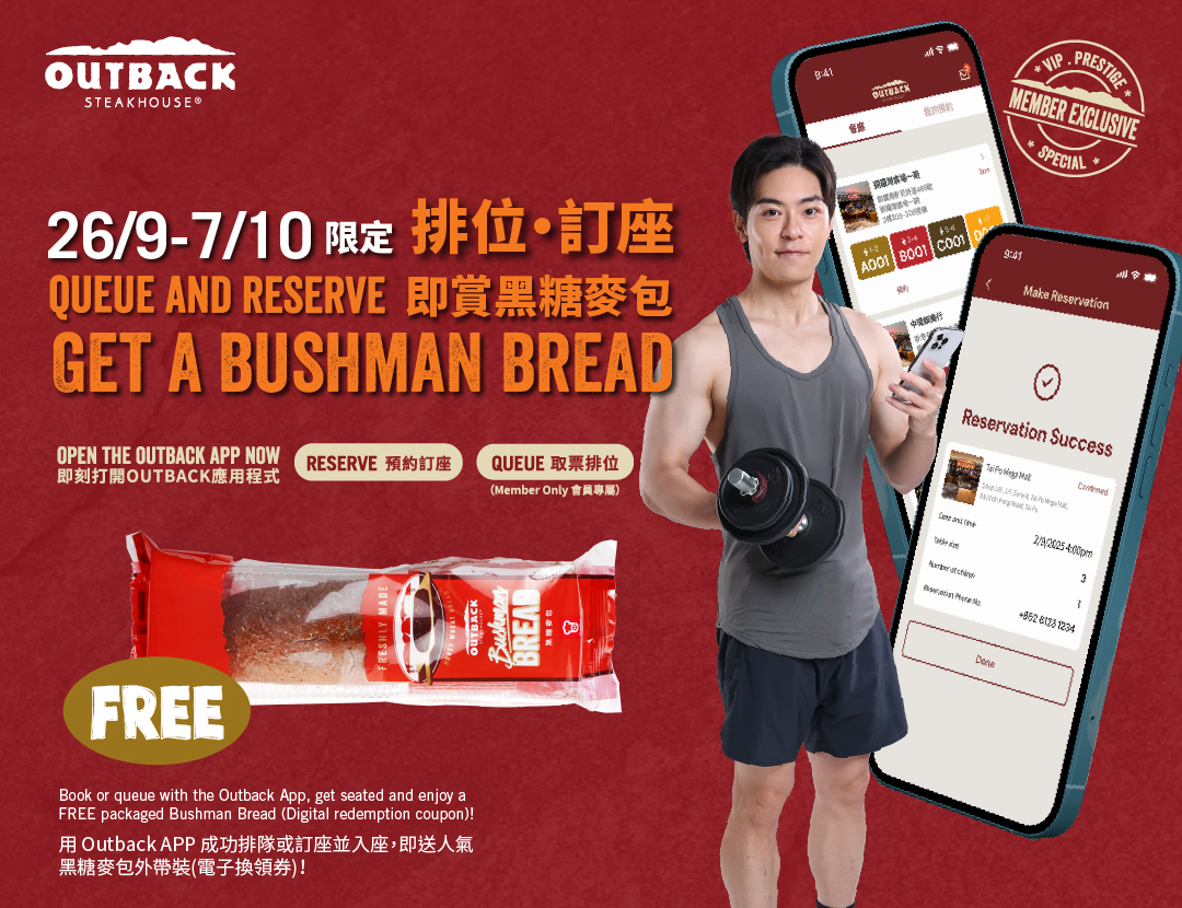 From September 26 to October 7, Outback members who use the Outback App “Queue” or “Reservation” feature and get seated will receive a FREE Bushman Bread Takeaway Pack e-coupon!